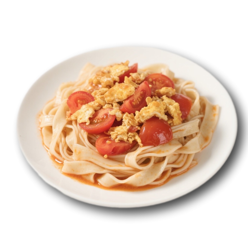 Zutaten: handgemachte Weizennudeln (Weizen, Wasser, Salz, Natron E500(ii)), Tomate, Eier, Ingwer, Knoblauch, Sojasauce(Wasser, Salz, Sojabohnen 11%, Zucker, Weizenmehl, Salz, Hühnerpulver, Pfeffer, Zucker, Sesamöl